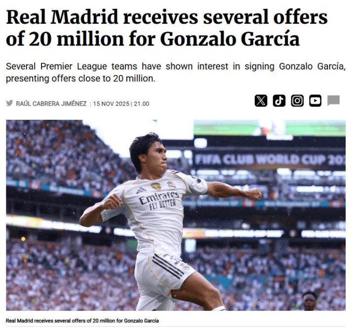 Gonzalo Garcia nổi tiếng ở Club World Cup, rất tài năng nhưng ở Real Madrid, Gonzalo Garcia phải cạnh tranh với Mpbapp và Vinicius nên việc vượt lên là điều cực kỳ khó khăn. Tờ "Echo" địa phương của Sunderland đưa tin có ít nhất 3 CLB Premier League quan tâm đến việc giới thiệu Gonzalo Garcia, và "Mèo đen" là một trong số đó.